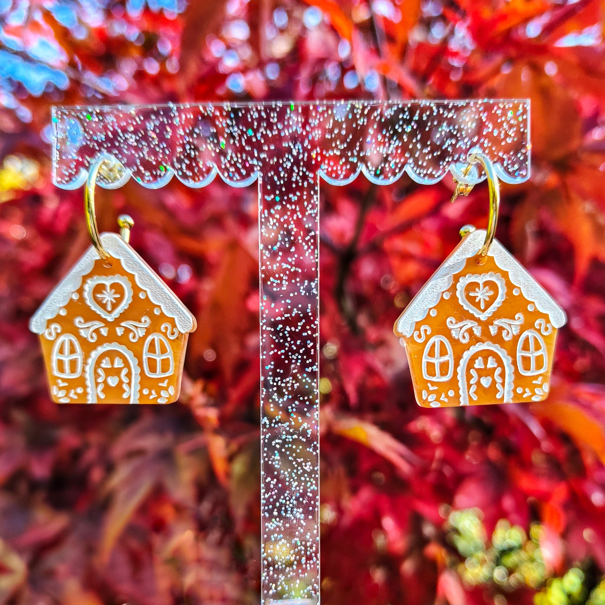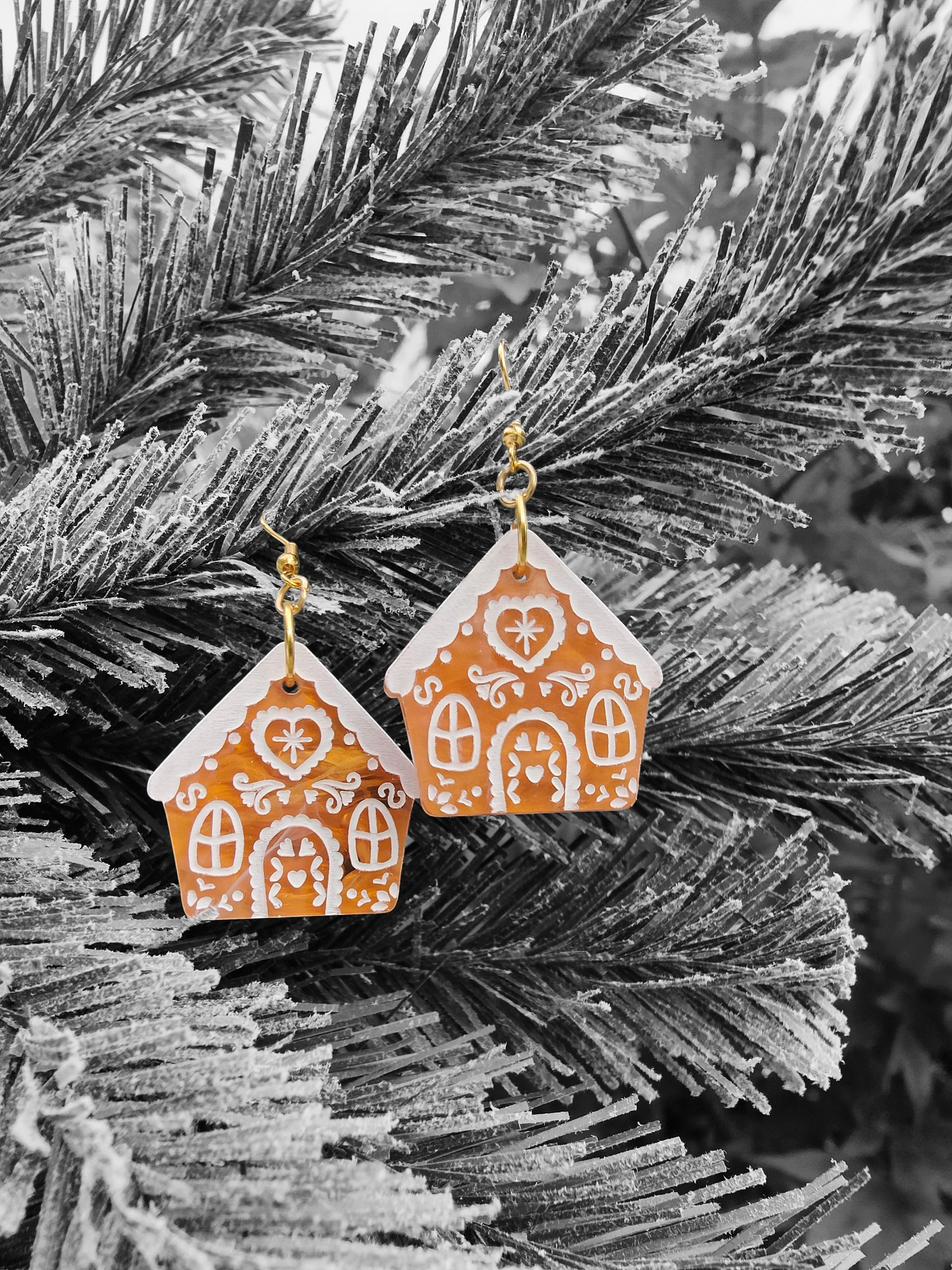 Cute and dainty gingerbread house, perfect for the festive season! Available in several options, including 'peppermint swirl' studs, gold plated hoops and gold plated hooks. Matching necklace available separately. Acrylic house section measures around 3.2 x 3.3cm.