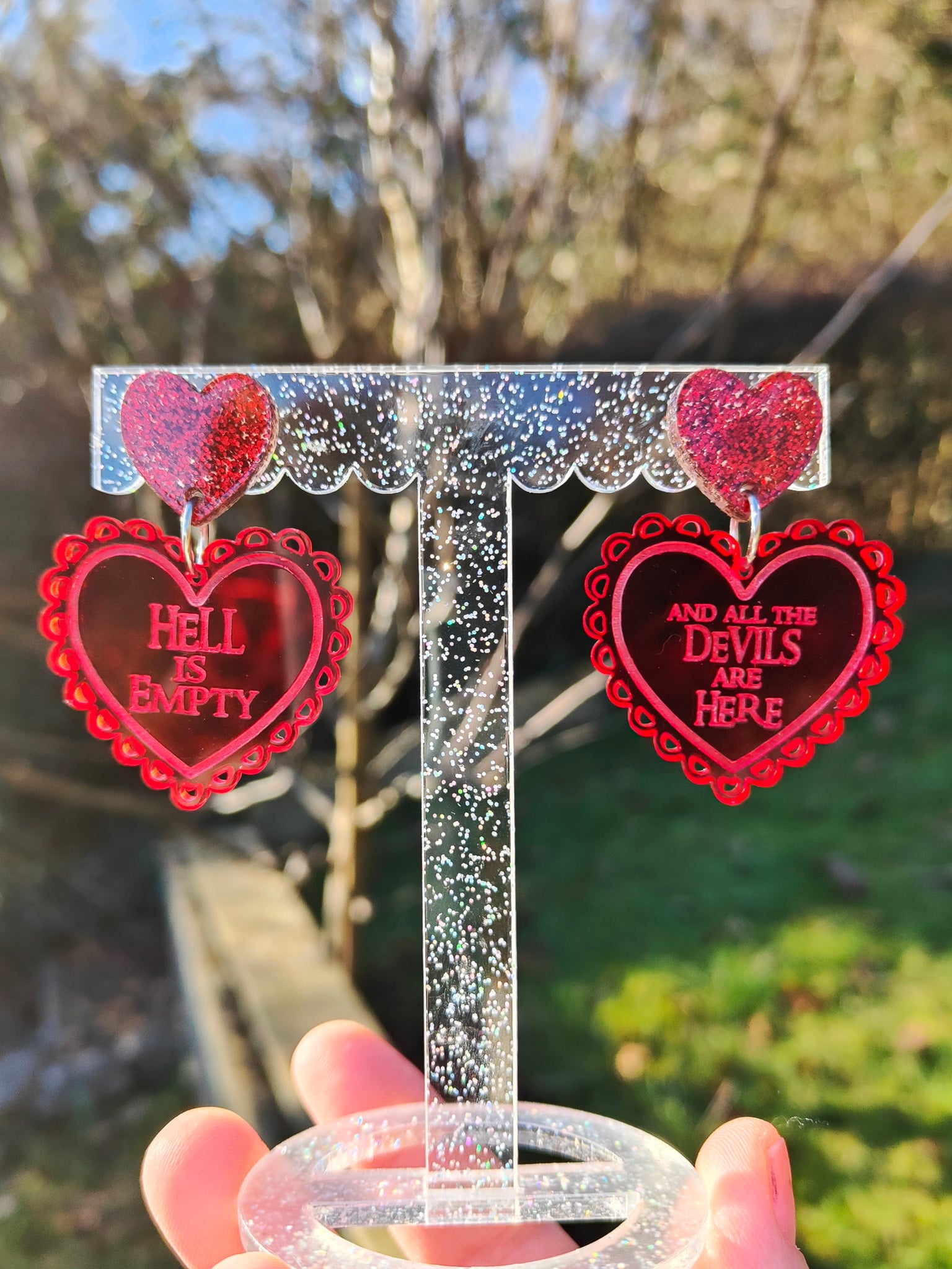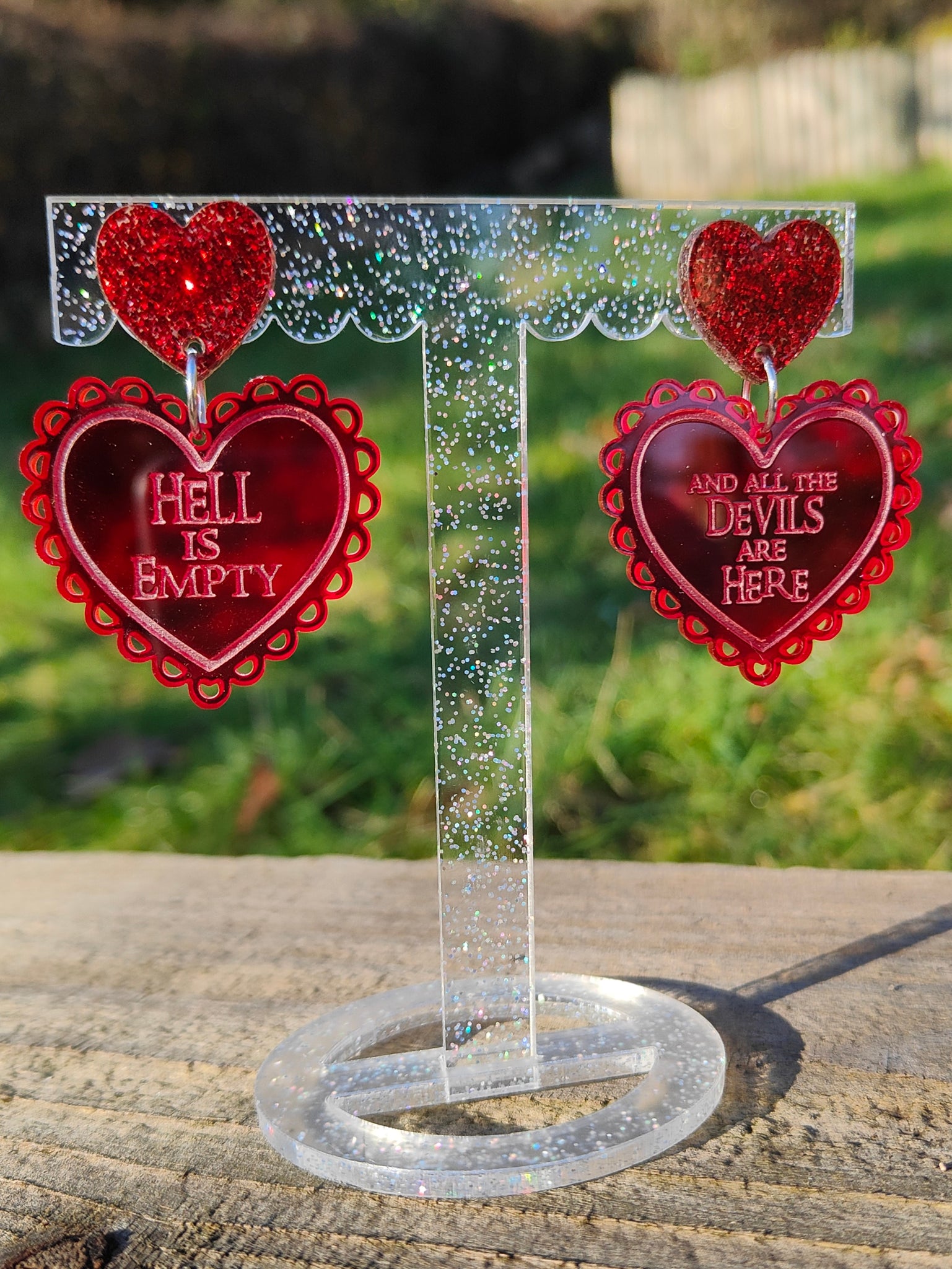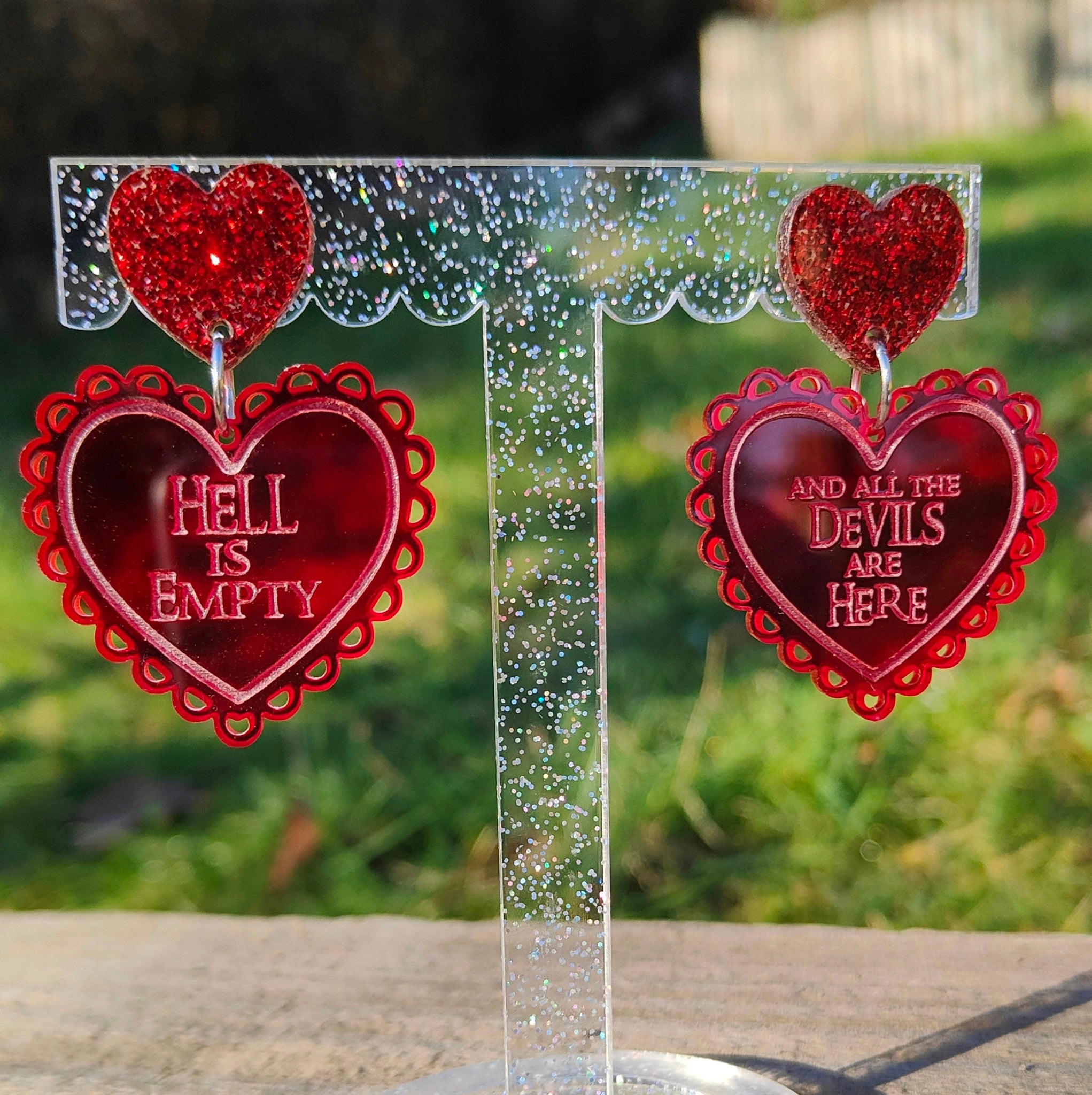 Featuring the Shakespeare quote 'Hell is empty and all the devils are here'. Translucent red heart acrylic earrings. Scallop heart measures around 4 x 4 cm. Please choose either heart stud (pictured) or surgical steel hook.