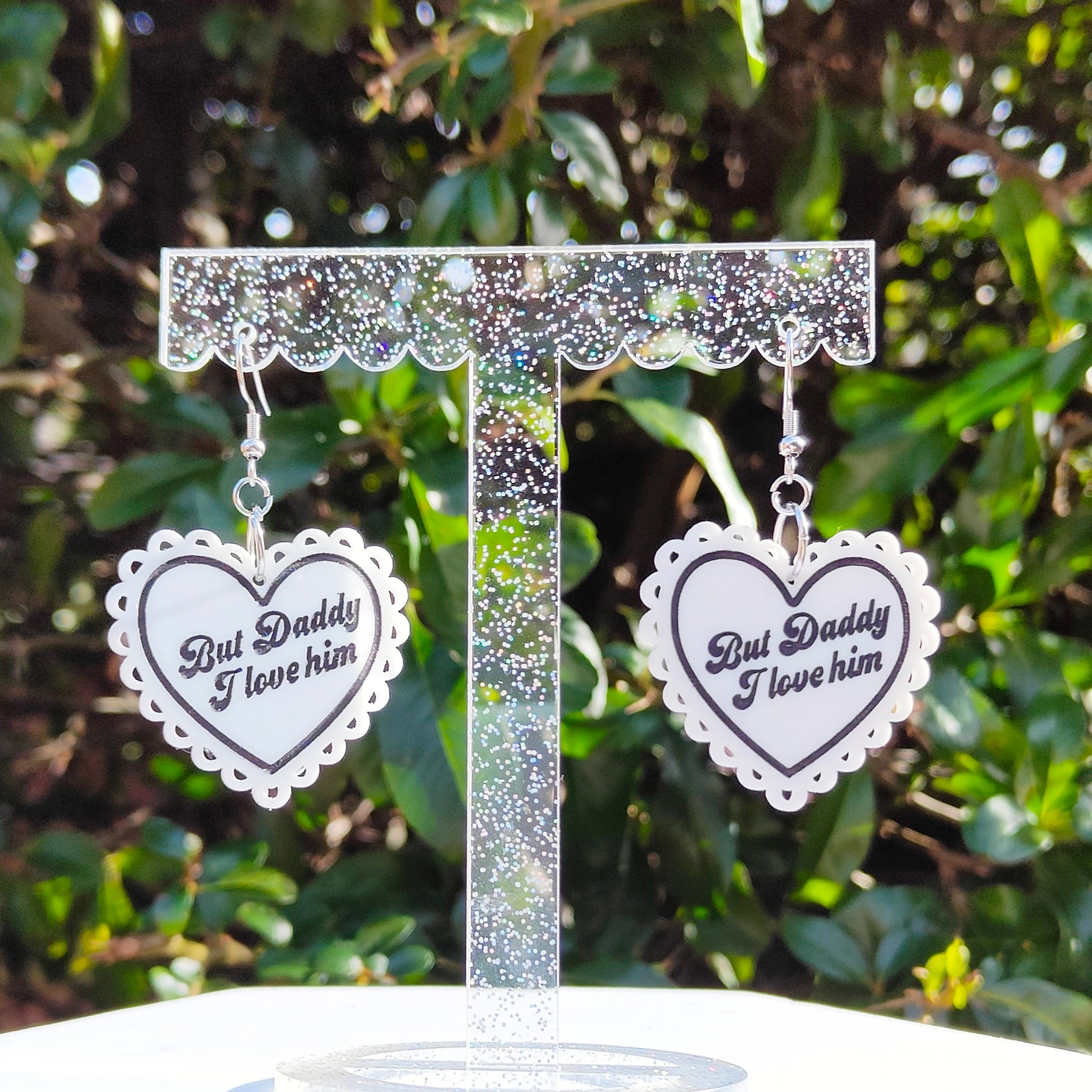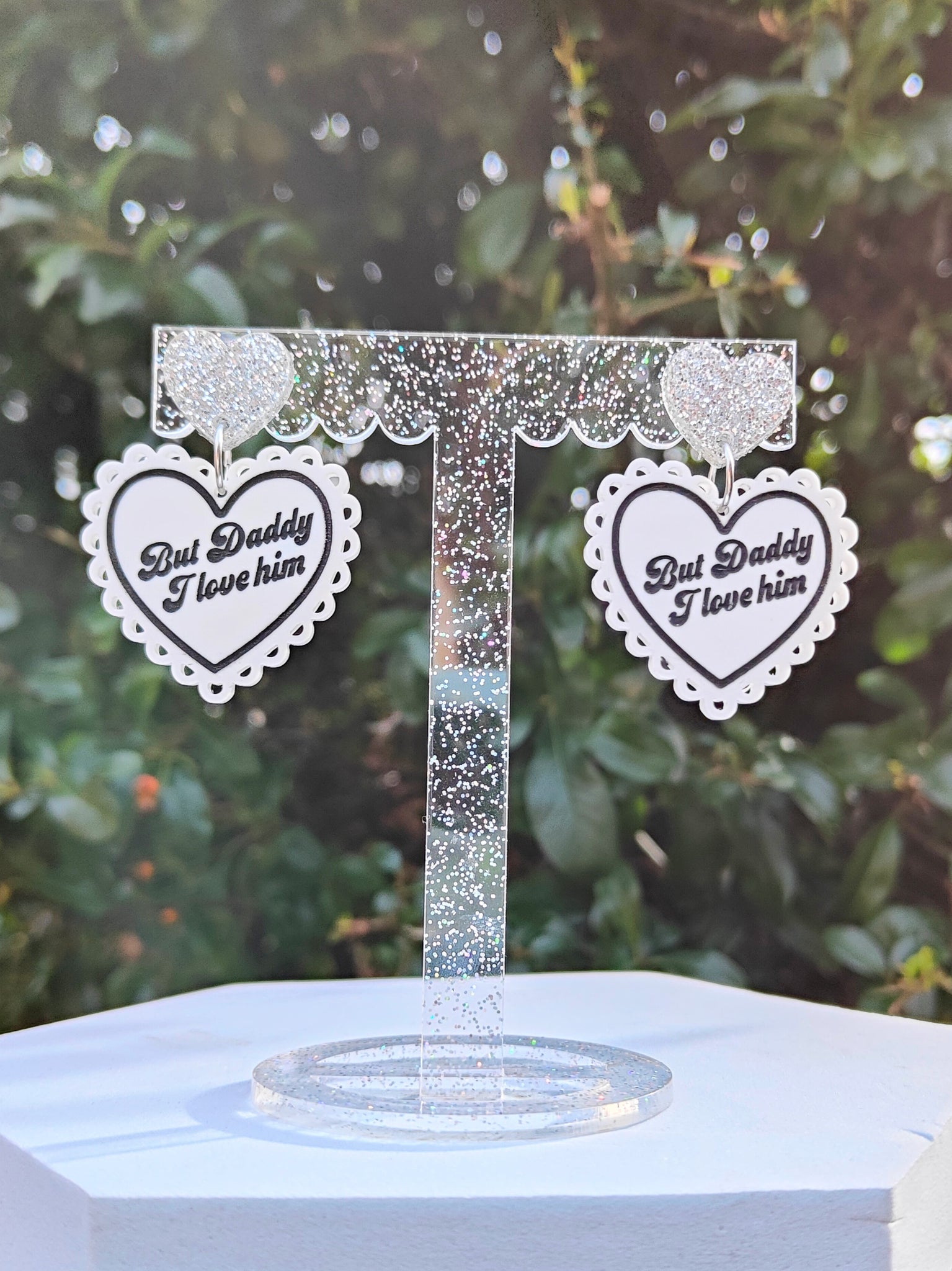 'But Daddy I love him' monochrome heart acrylic earrings. Scallop heart measures around 4 x 4 cm. Please choose either silver glitter heart stud or hook.