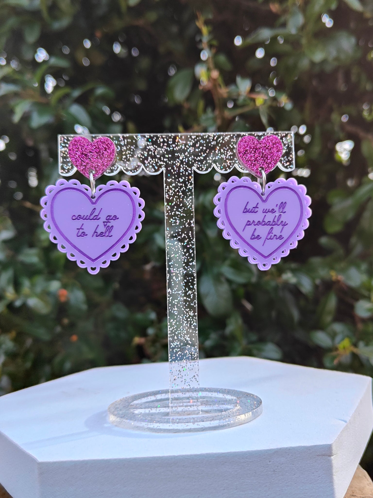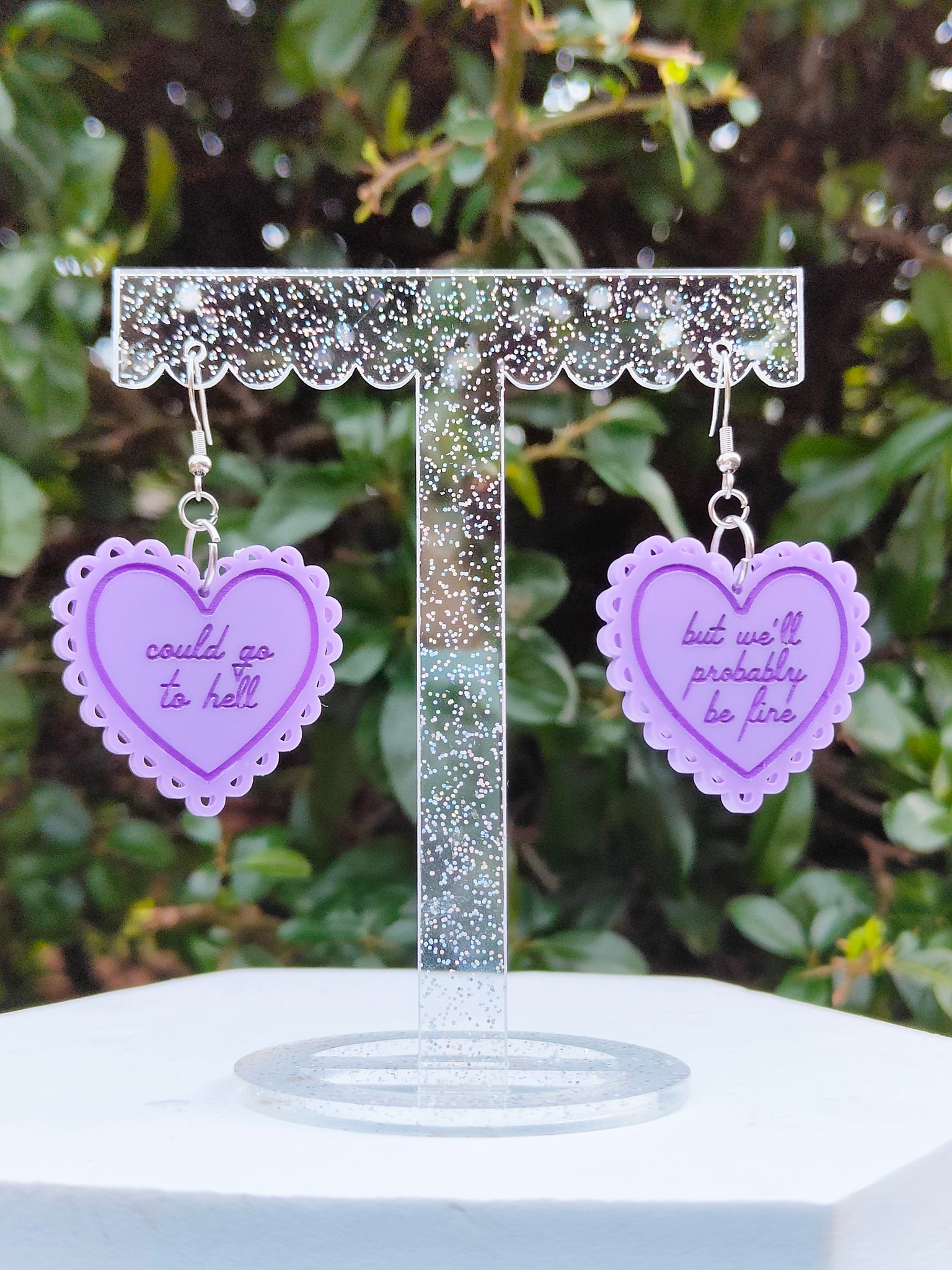 'Could go to hell but we'll probably be fine' Chappell Roan inspired pastel purple heart acrylic earrings. Scallop heart measures around 4 x 4 cm. Please choose either heart stud or hook.
