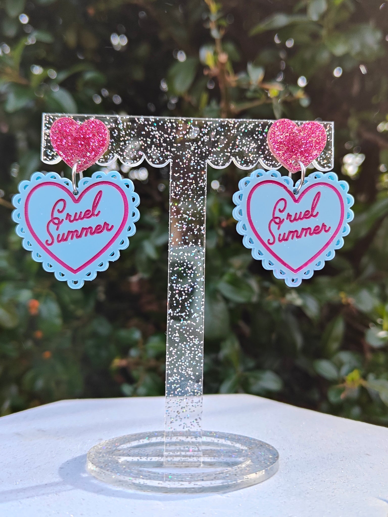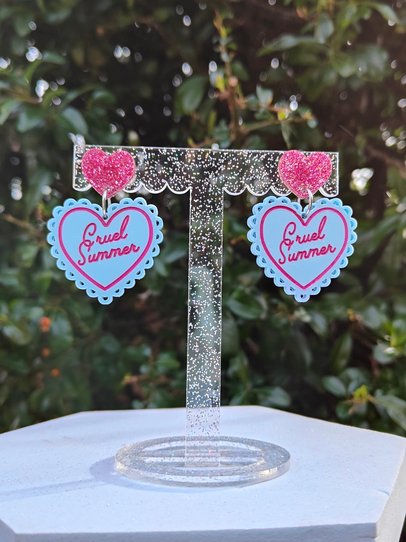 'Cruel Summer' blue and pink heart acrylic earrings. Scallop heart measures around 4 x 4 cm. Please choose either heart stud or hook.