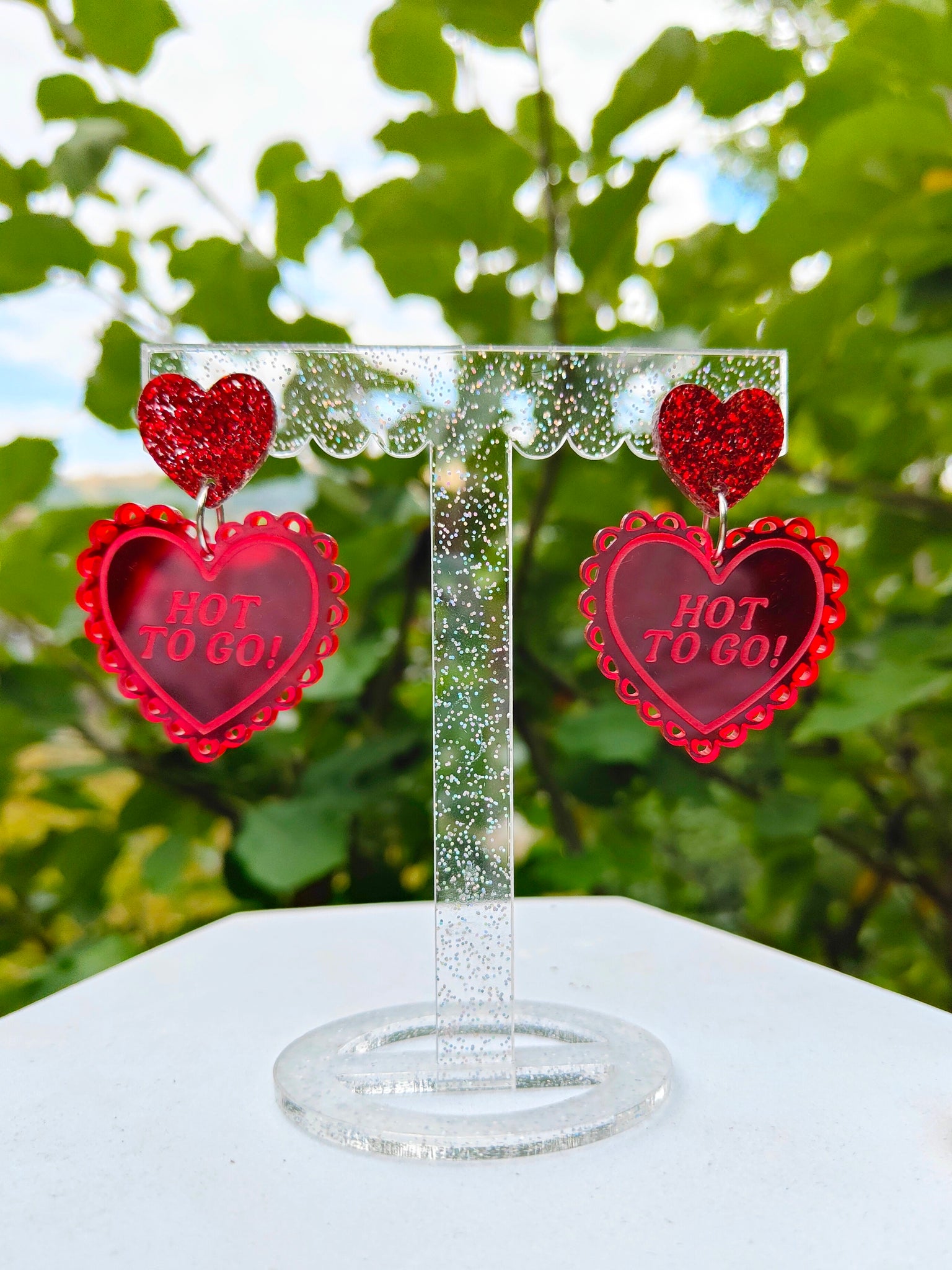 'HOT TO GO' Chappell Roan inspired red translucent heart acrylic earrings. Scallop heart measures around 4 x 4 cm. Please choose either heart stud or hook.