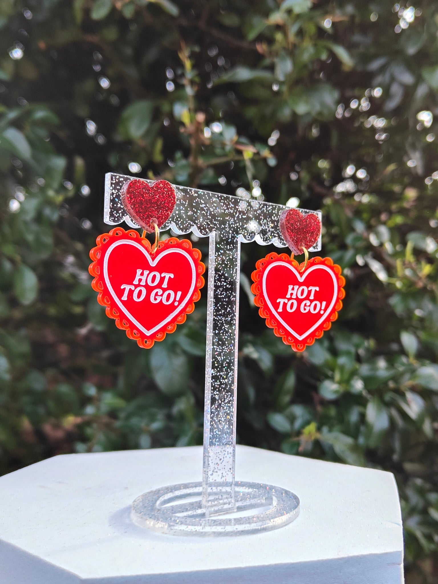 'HOT TO GO' Chappell Roan inspired red heart acrylic earrings. Scallop heart measures around 4 x 4 cm. Please choose either heart stud or hook.