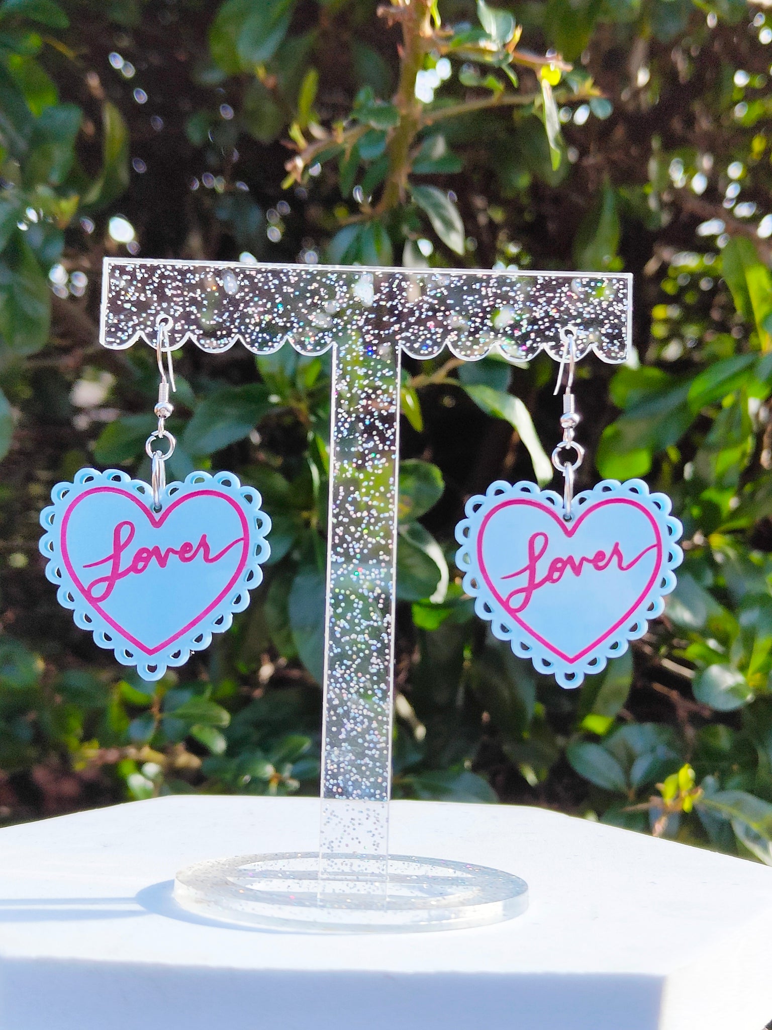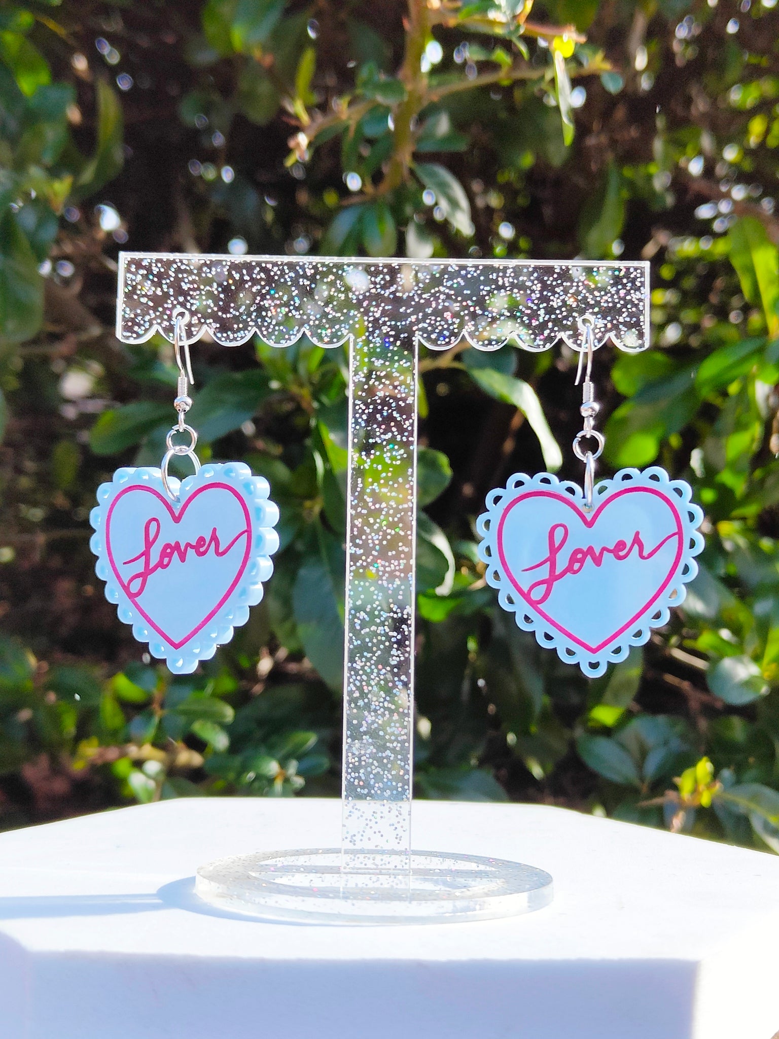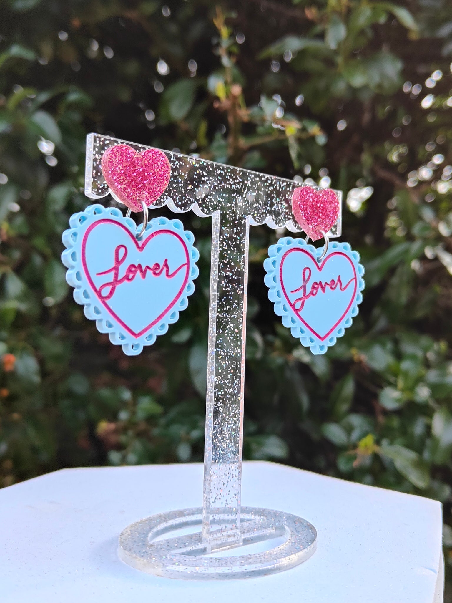 'Lover' blue and pink heart acrylic earrings. Scallop heart measures around 4 x 4 cm. Please choose either heart stud or hook.