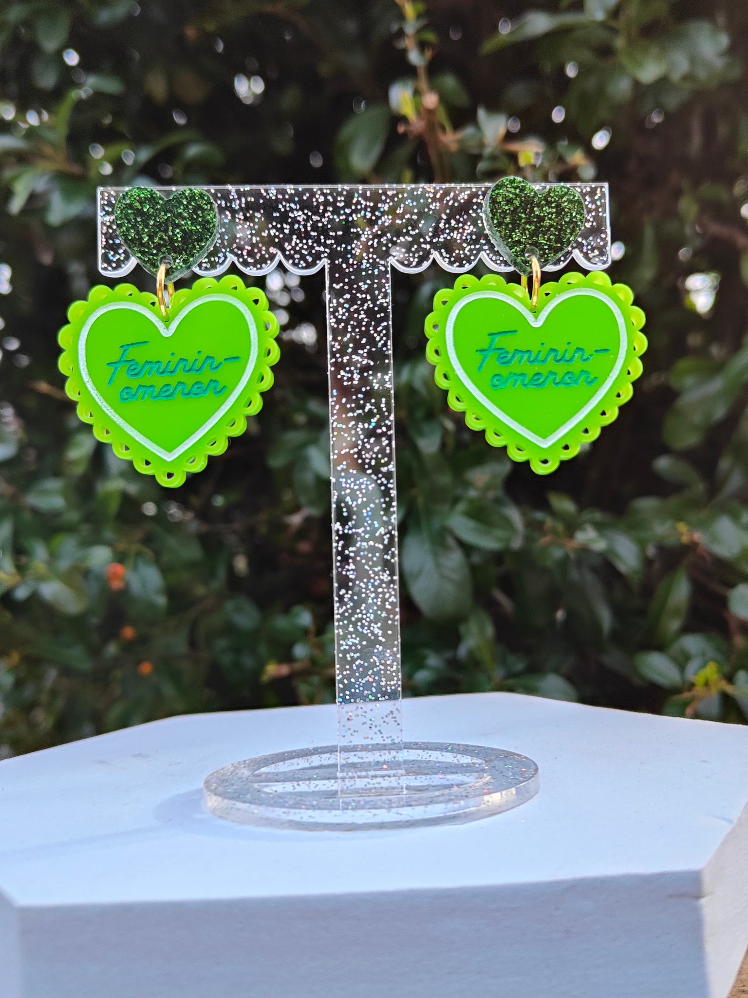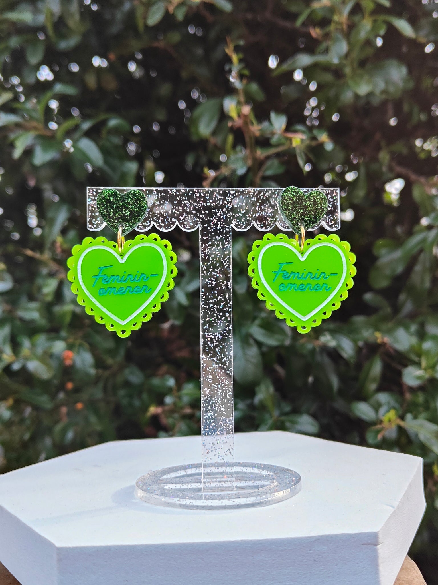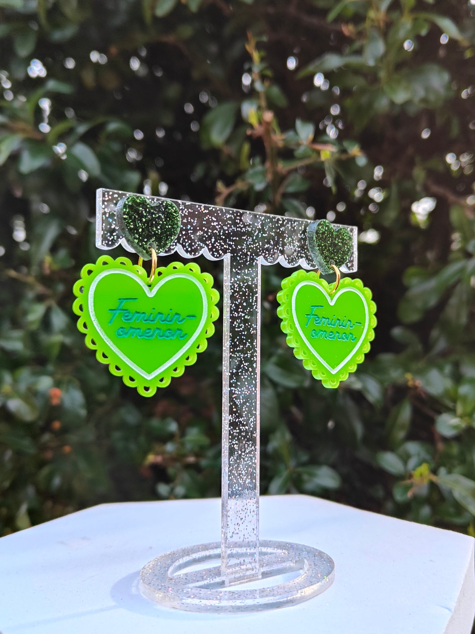 'Femininomenon' Chappell Roan inspired lime green heart acrylic earrings. Scallop heart measures around 4 x 4 cm. Please choose either heart stud or hook.