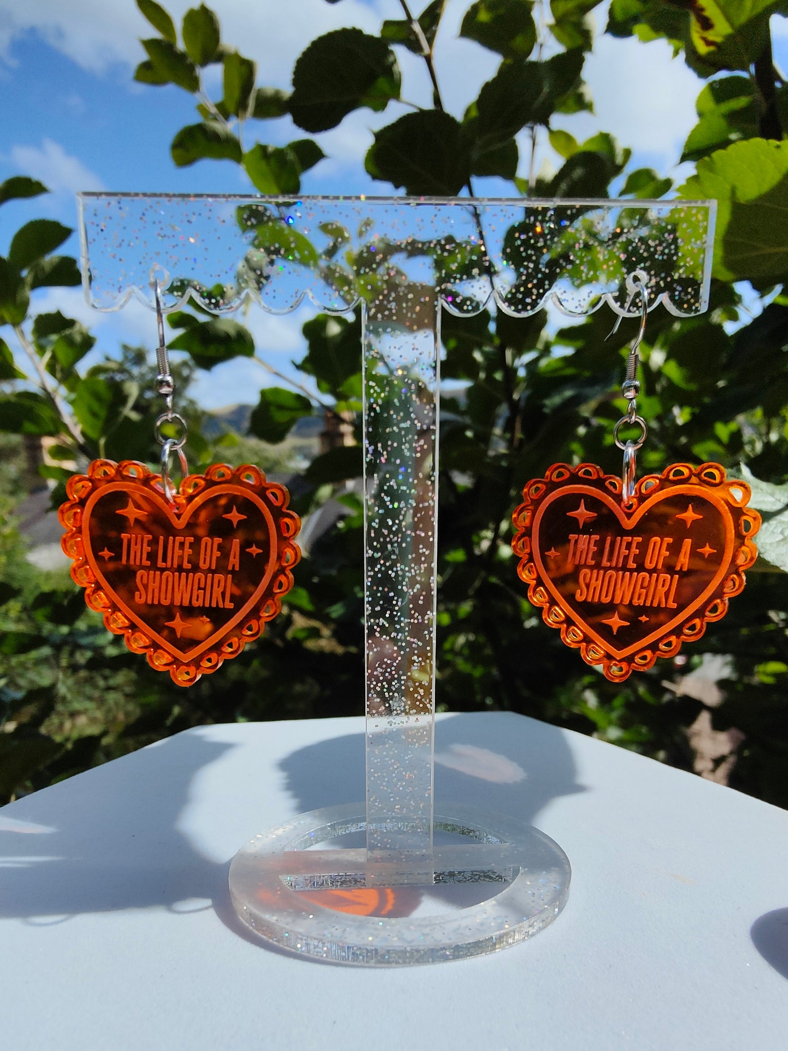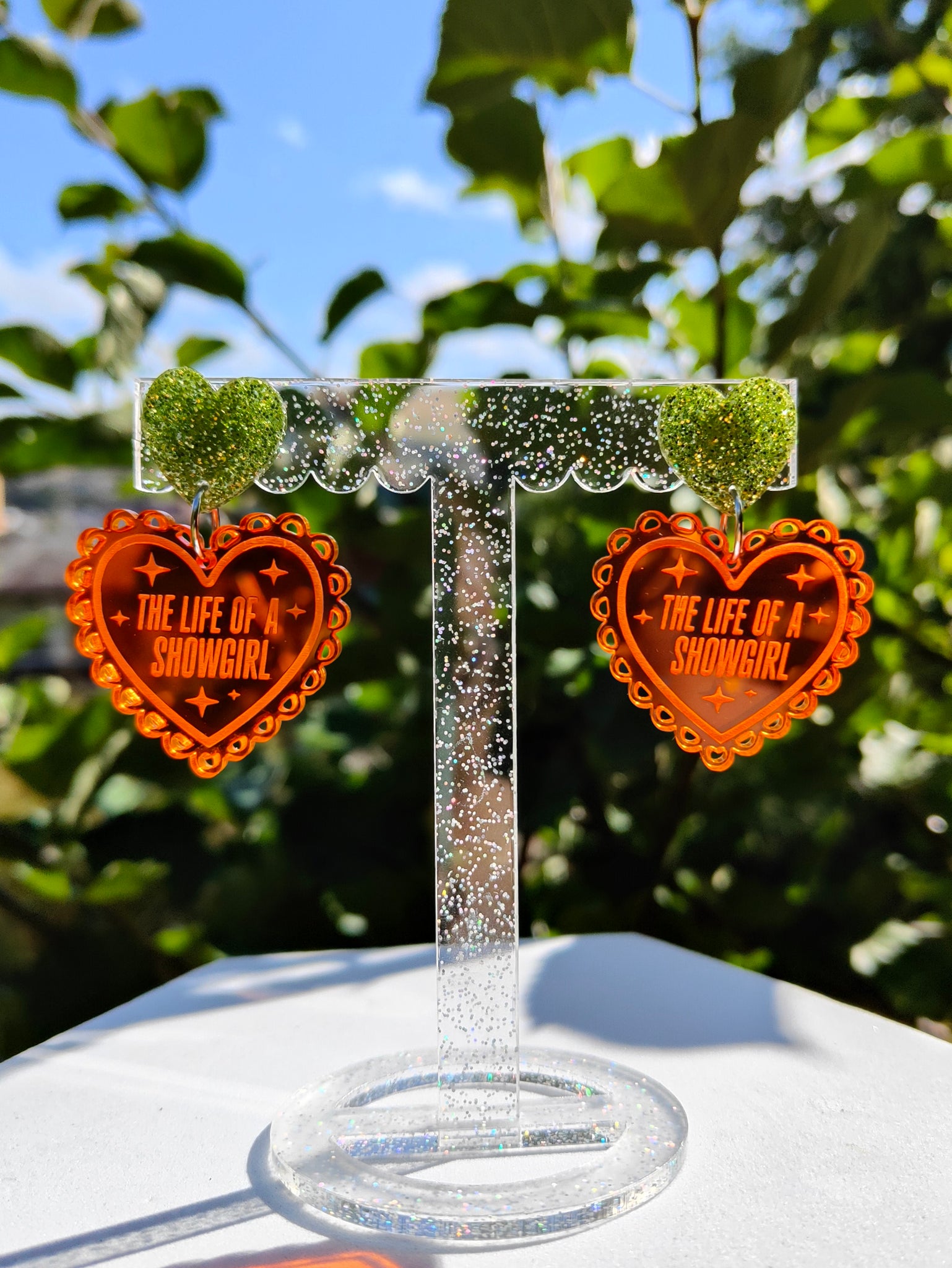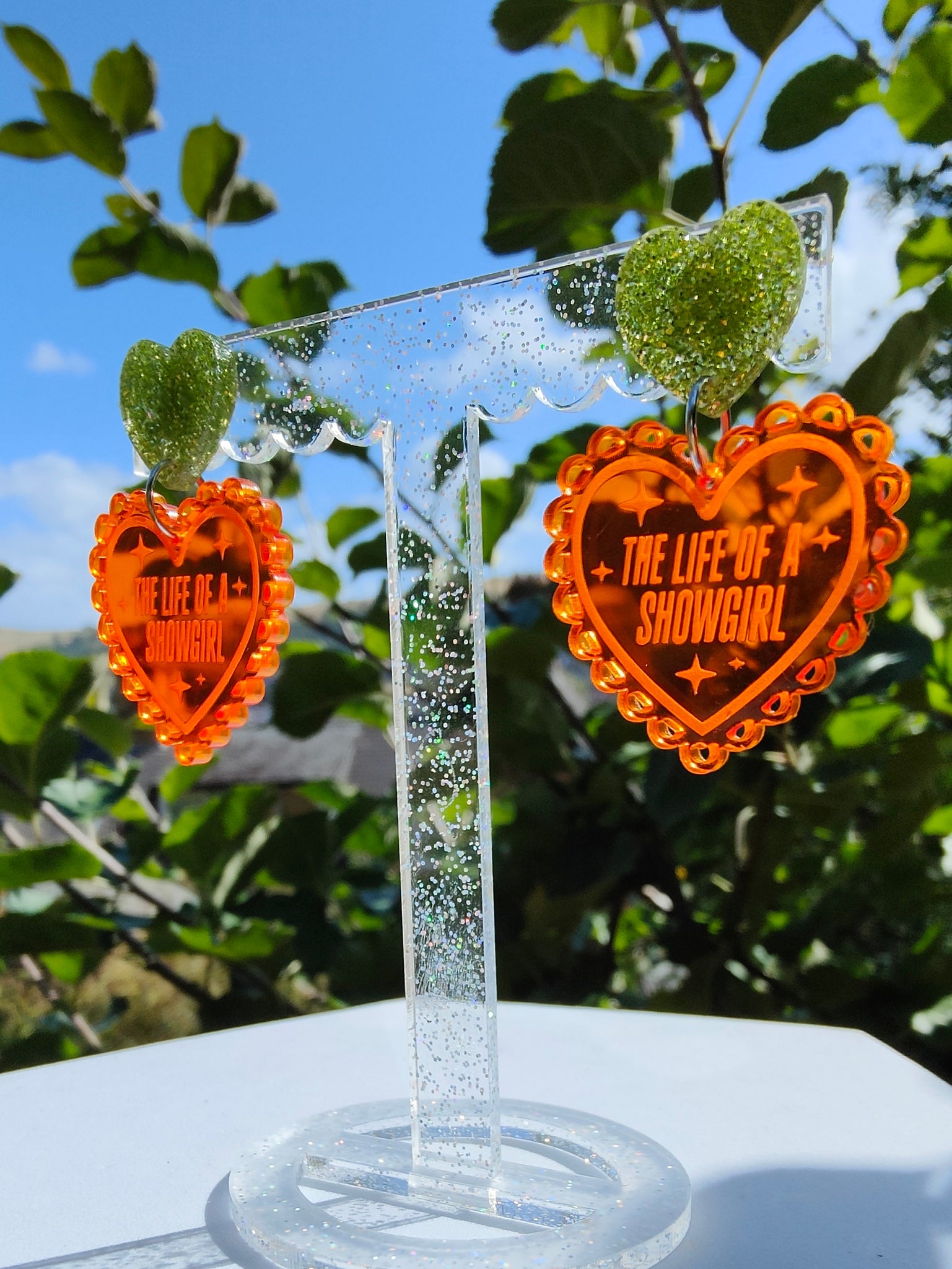 'The Life of a Showgirl' translucent orange with green heart, orange heart or hook acrylic earrings. Scallop heart measures around 4 x 4 cm. Please choose either heart stud or hook.